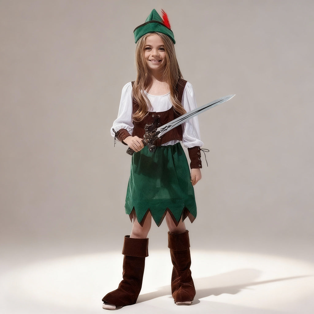 Ce déguisement pirate pour fille se distingue par ses couleurs originales et son allure audacieuse. La tenue débute avec une chemise blanche à manches longues, ample et confortable, sur laquelle vient s’ajuster un corset en cuir marron qui descend jusqu’au bassin. Le bas est composé d’une jupe verte épaisse, coupée aux genoux avec un effet déchiré pour rappeler l’aspect sauvage des flibustières. Aux pieds, une paire de bottines marron vient s’accorder parfaitement avec le corset. Enfin, l’ensemble est sublimé par un chapeau tricorne vert orné d’une plume de perroquet rouge, détail flamboyant qui apporte à ce costume une touche exotique et unique.