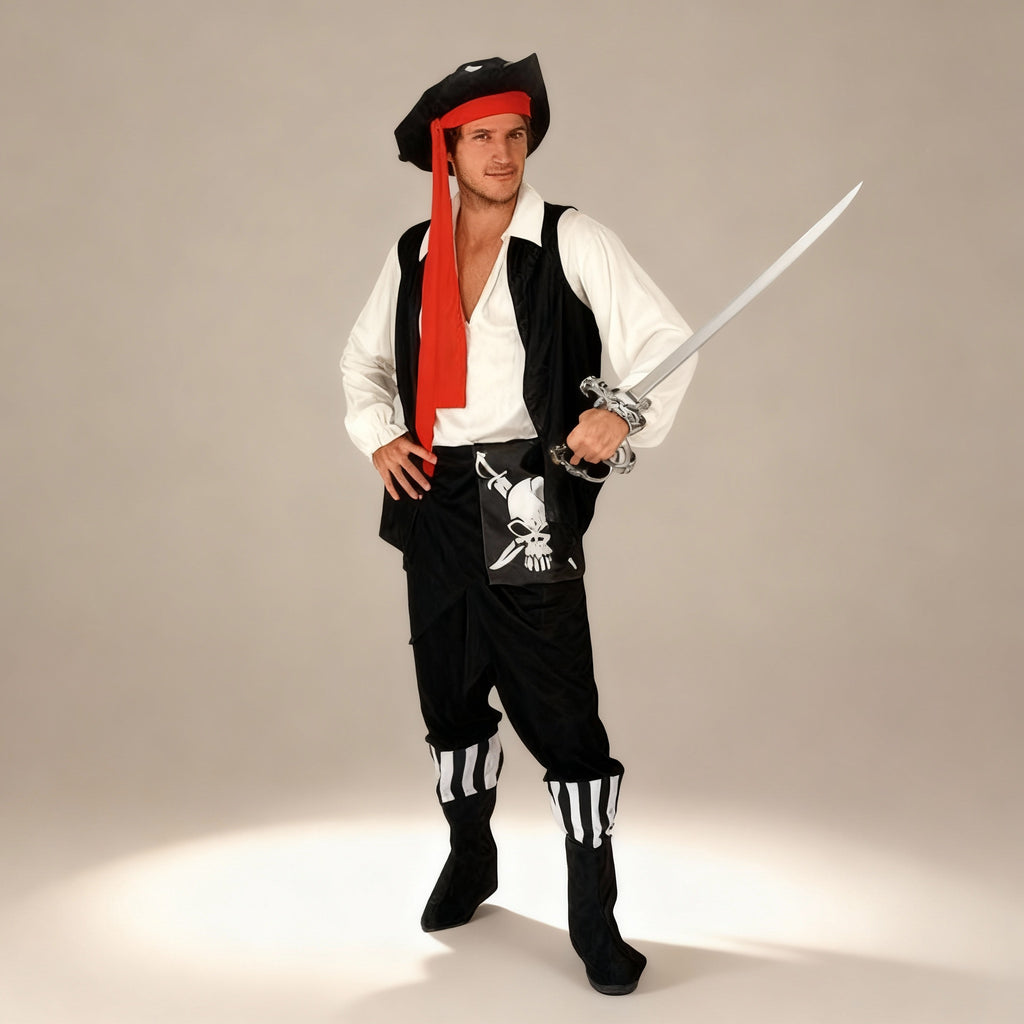 Ce déguisement pirate homme séduit par son style simple mais charismatique, idéal pour incarner un aventurier des mers. La chemise blanche à manches longues, dotée d’un large col en V plongeant jusqu’à mi-ventre, confère un aspect à la fois décontracté et audacieux. Un gilet noir fin, porté ouvert, vient souligner la silhouette tout en gardant une allure légère. Le pantalon noir, associé à des bottines montant aux chevilles, assure confort et liberté de mouvement. Pour parfaire l’ensemble, un chapeau pirate inspiré de celui de Will Turner dans Pirates des Caraïbes, orné d’un foulard rouge enroulé autour, complète ce costume unique et authentique.