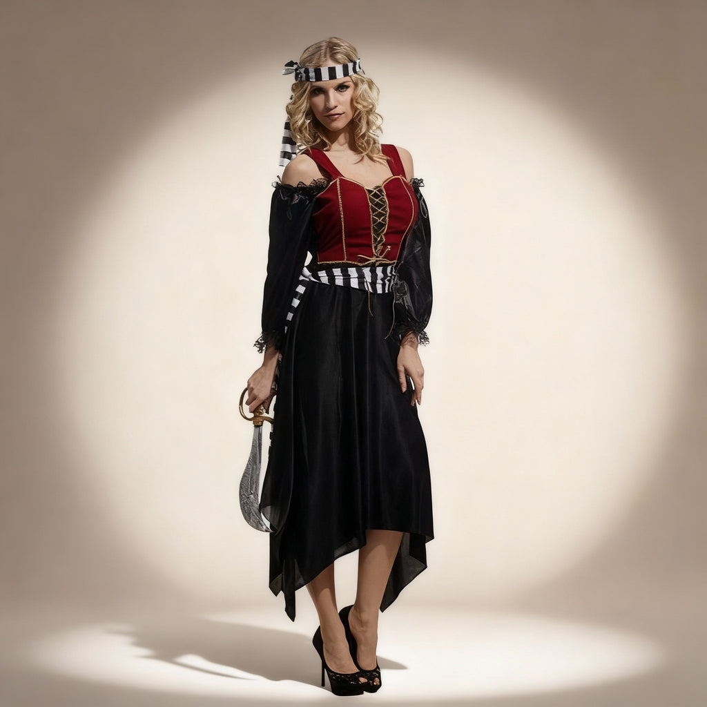 Incarnez une pirate ténébreuse et envoûtante avec ce déguisement entièrement noir au style raffiné. Le corset, en velours luxueux, laisse le buste et les épaules apparents, tout en offrant une coupe sensuelle et élégante. De longues manches assorties descendent jusqu’aux poignets, où elles s’évasent en velours pour un effet théâtral. La jupe, ample et épaisse, déploie toute sa volupté en tombant juste au-dessus des chevilles, donnant une allure majestueuse. Un foulard à la taille, alternant des bandes noires et blanches verticales, vient marquer la silhouette et ajouter du contraste. L’ensemble est complété par un bandeau assorti à nouer autour de la tête, parfait pour un style pirate authentique et élégant.