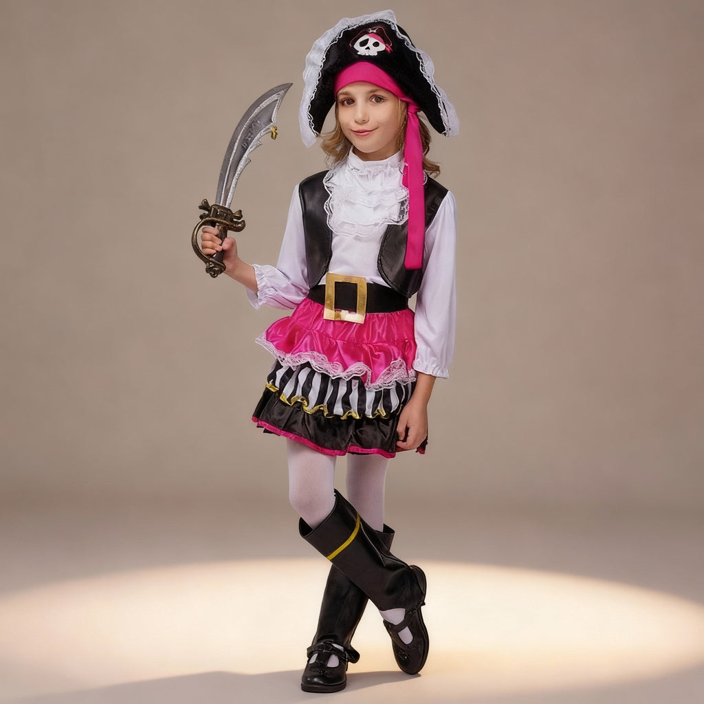 Ce déguisement pirate pour fille de 9 ans combine élégance et esprit d’aventure. La tenue commence par une chemise blanche en flanelle à manches longues, recouverte d’un fin gilet noir qui habille les côtés tout en laissant le devant apparent. La taille est soulignée par une ceinture en tissu rehaussée d’une large boucle dorée, ajoutant une touche authentique. Le bas se compose d’une jupe à trois niveaux descendant jusqu’aux genoux : une partie supérieure rose, suivie d’un pan à rayures noires et blanches, puis d’une finition en dentelle noire fluide. Des bottines noires mi-mollet, décorées d’une bande dorée, viennent compléter le bas. Enfin, un majestueux tricorne noir orné d’un Jolly Roger et de dentelle blanche, posé sur un bandana rose dont un pan tombe sur l’épaule, parachève ce costume raffiné et intrépide.