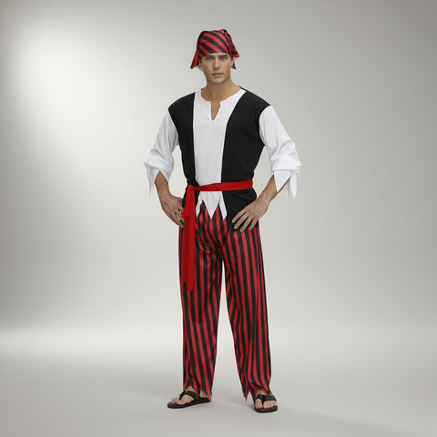 Ce déguisement de pirate spécialement conçu pour adolescent allie élégance et réalisme. La chemise blanche ample, à col plongeant, constitue la pièce centrale. Elle est recouverte d’une veste noire en tissus, ouverte, dont le l'aspect cintré et sans manches renforcent le style sauvage. Une large ceinture en tissu rouge vient structurer la silhouette à la taille. Le pantalon ample à rayures verticales rouges et noires descend jusqu’aux chevilles et se porte aisément avec des chaussures classiques. Pour accentuer l’allure intrépide, un bandeau assorti recouvre la tête.