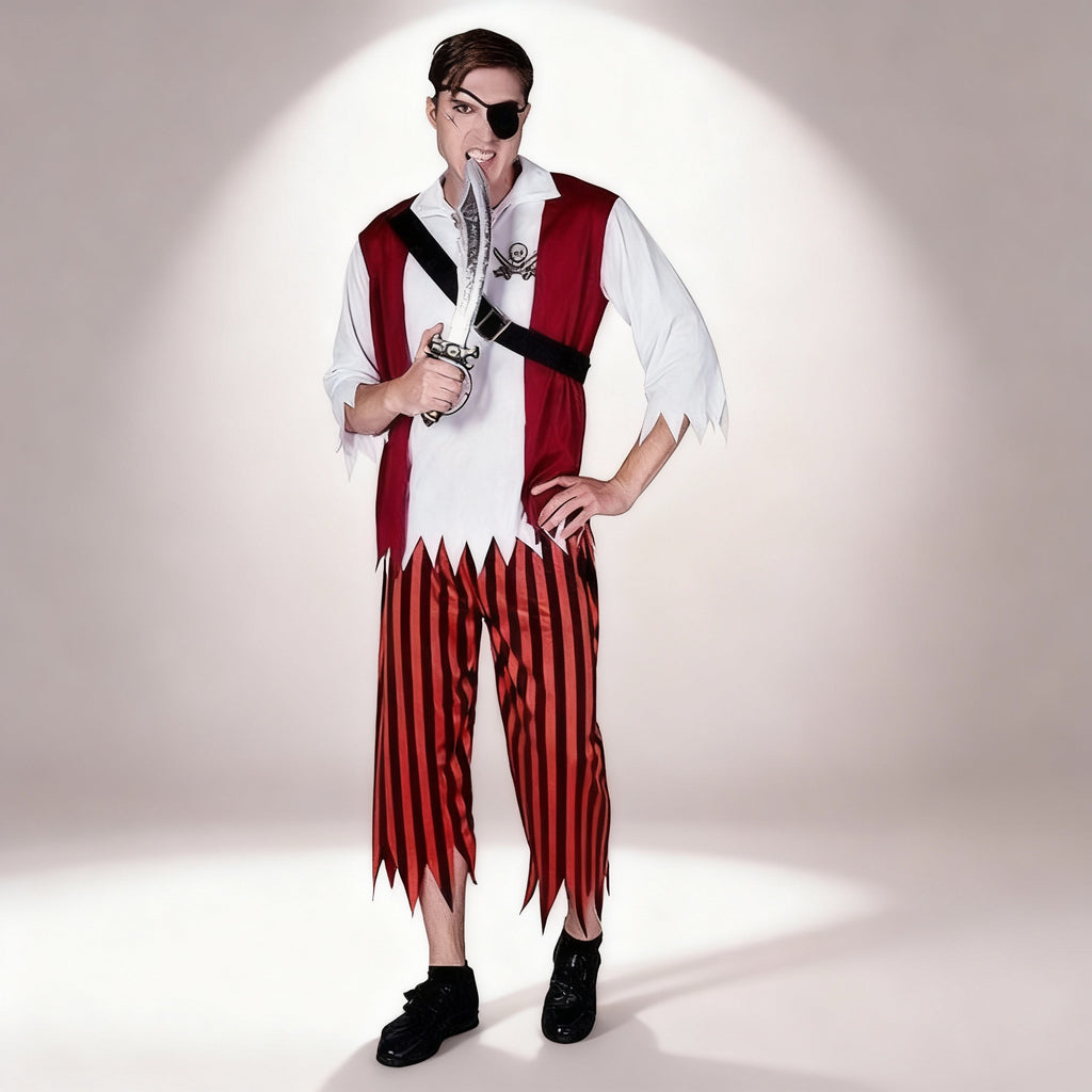 Ce déguisement pirate homme spécial Halloween mise sur un style sauvage et effrayant, parfait pour vos soirées costumées. La tenue commence par une large chemise blanche à manches courtes, dont les extrémités déchirées renforcent l’effet usé et terrifiant. Par-dessus, un gilet rouge écarlate vient recouvrir les épaules et les côtés, tout en laissant l’avant complètement ouvert pour un look brut et audacieux. Le pantalon ample, orné de bandes verticales noires et rouges, se termine lui aussi par des bords effilochés, s’arrêtant à mi-mollet pour laisser apparaître vos chaussures. Enfin, un cache-œil noir complète ce costume, accentuant son allure inquiétante et pirate maudit.
